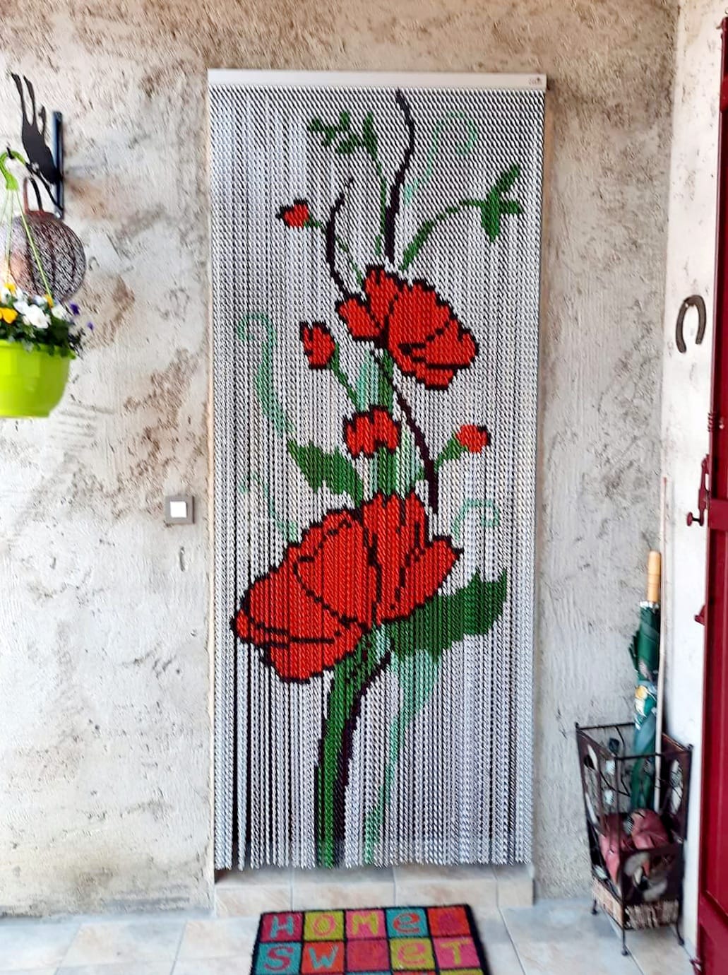 Résultat : un rideau utile (air, lumière, anti instectes, passage) + une signature visuelle unique, parfaite pour une maison, une entrée, une boutique ou un espace pro.